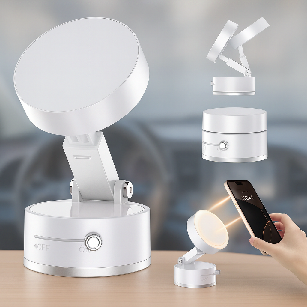 El Soporte Magnético de Ventosa combina adsorción magnética avanzada con una ventosa de TPE de alta elasticidad. Se adhiere firme a superficies lisas (vidrio, plástico, metal, cerámica, acrílico) y se pliega para llevar a cualquier parte. Ideal para auto, cocina, baño, oficina o viajes.